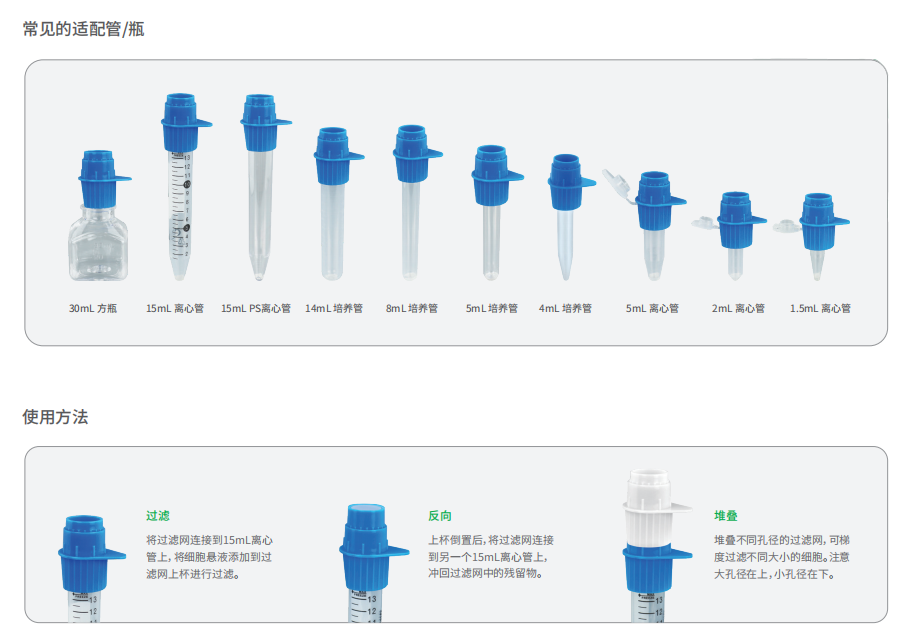 細胞過濾網(wǎng)是一種無菌篩分裝置,可快速地從細胞簇和組織中分離和過濾原代細胞,有效地去除細胞懸液中的細胞聚集體或大顆粒,以保證后續(xù)流式細胞術、細胞分選等實驗的準確性。