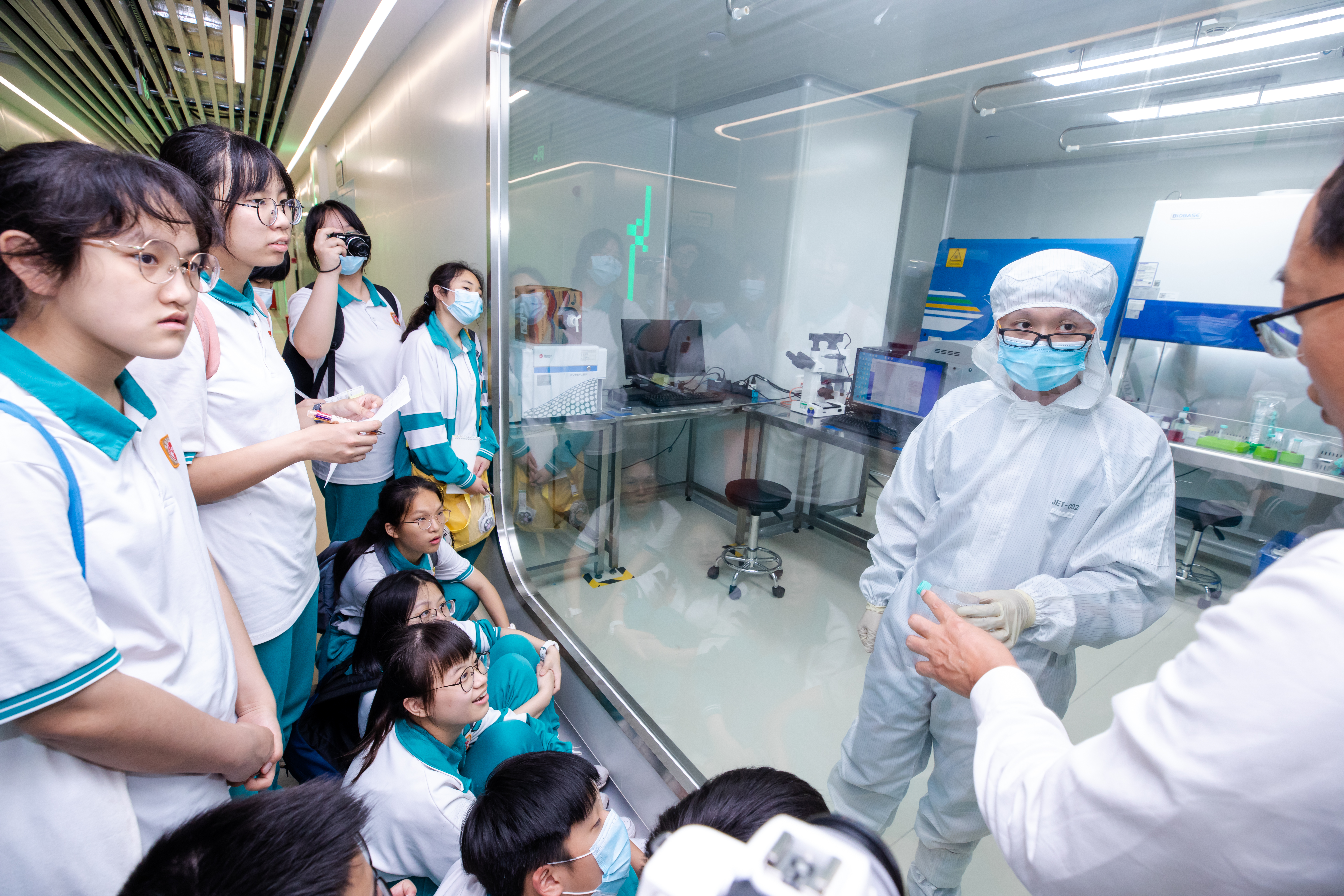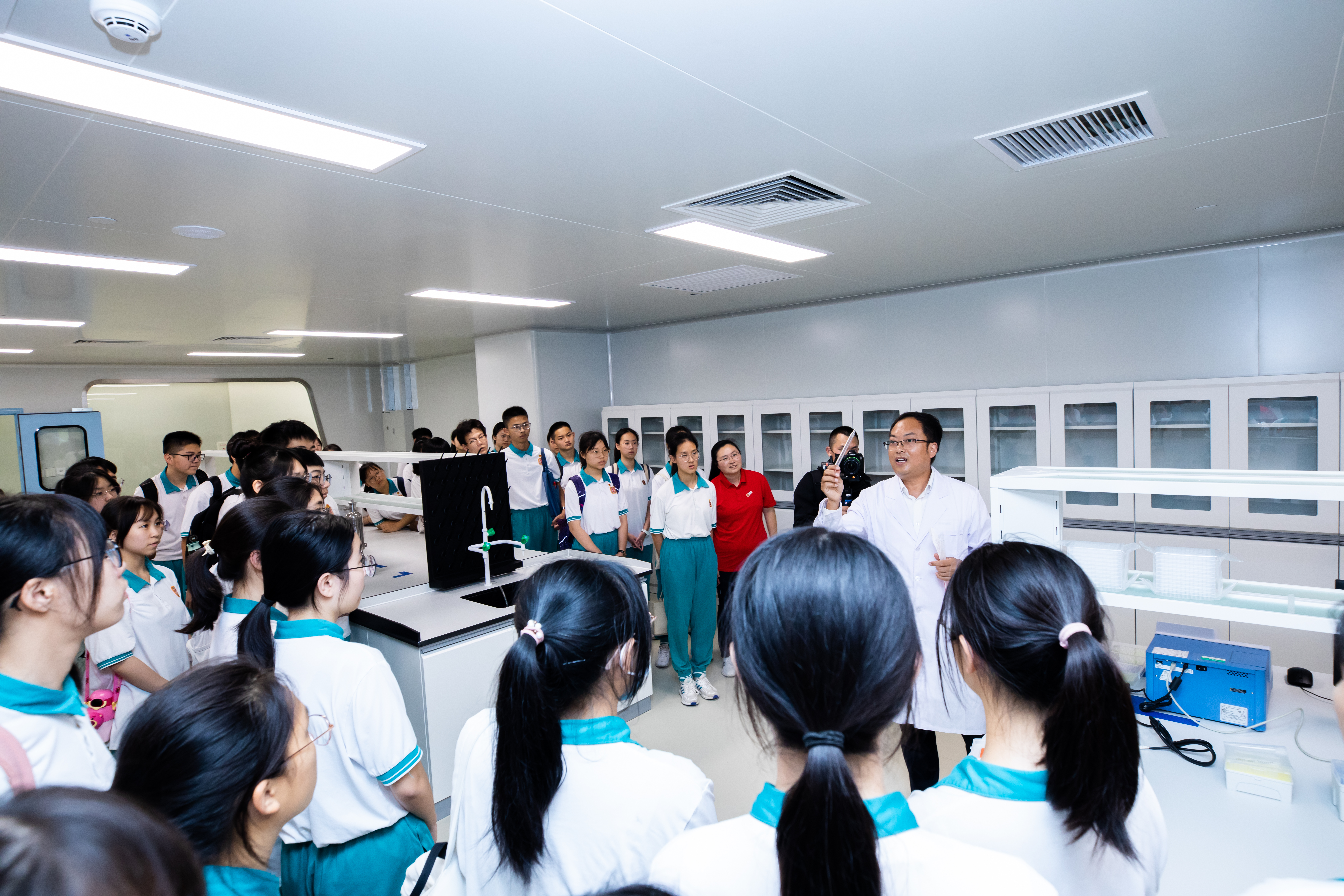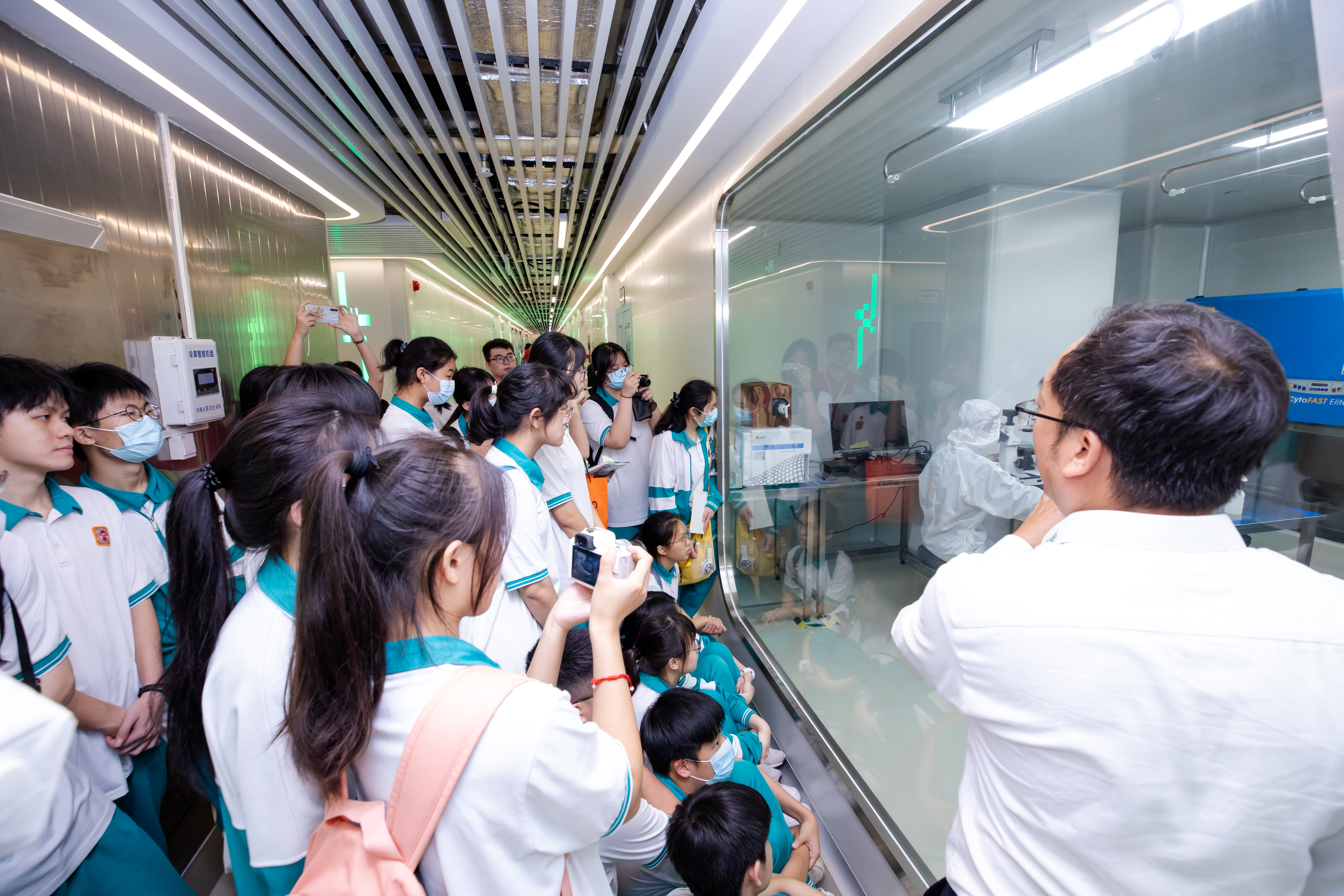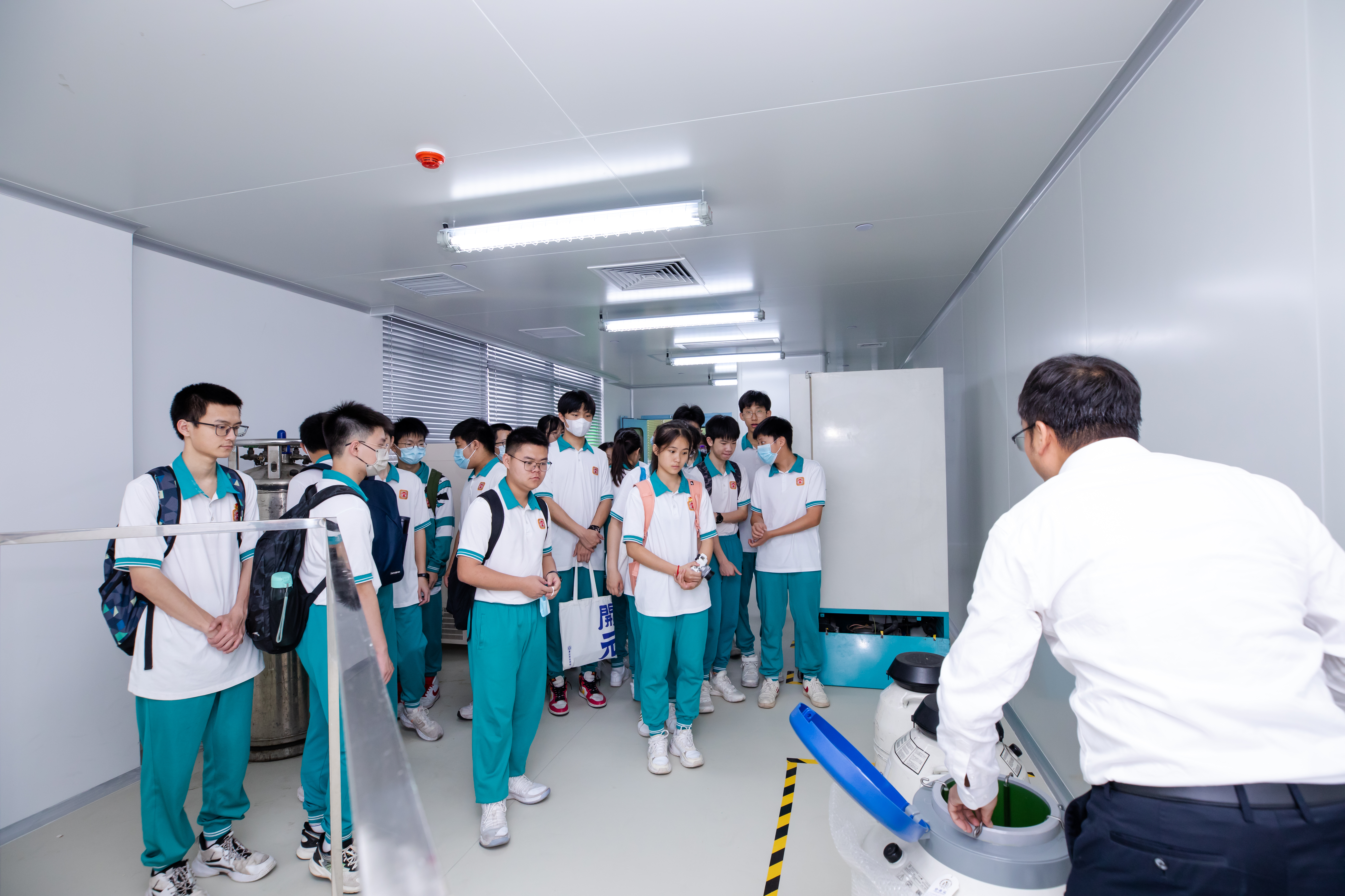 此次研學之旅,廣州開元學校師生不僅參觀了潔特生物的沉浸式生命科學體驗廳,還前往生產一線了解潔特生物最先進的無人工廠與智能化設備。同時,他們還來到潔特檢測中心,通過高精密的儀器設備與細胞零距離“見面”。