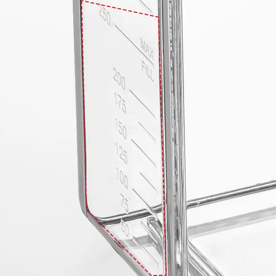 ◆ 瓶側(cè)設(shè)有清晰的刻度及最大工作容量參考線提示,便于觀察加液量。