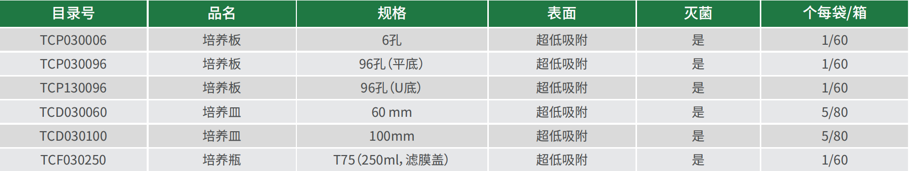 超低吸附細(xì)胞培養(yǎng)板有6孔、96孔平底、96孔U底三個(gè)規(guī)格;超低吸附細(xì)胞培養(yǎng)皿有60mm、100mm兩個(gè)規(guī)格;超低吸附細(xì)胞培養(yǎng)瓶有T75一個(gè)規(guī)格。